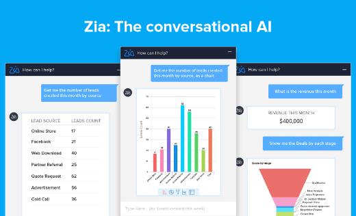 In 2017, Zoho introduced Zia, an artificial intelligence (AI) and machine learning (ML) powered virtual assistant available in the the Zoho productivity suite. That is, from Zoho Sheets to Zoho Notebook, Zoho CRM, Zoho Mail, Zoho SalesIQ, and Zoho Desk.